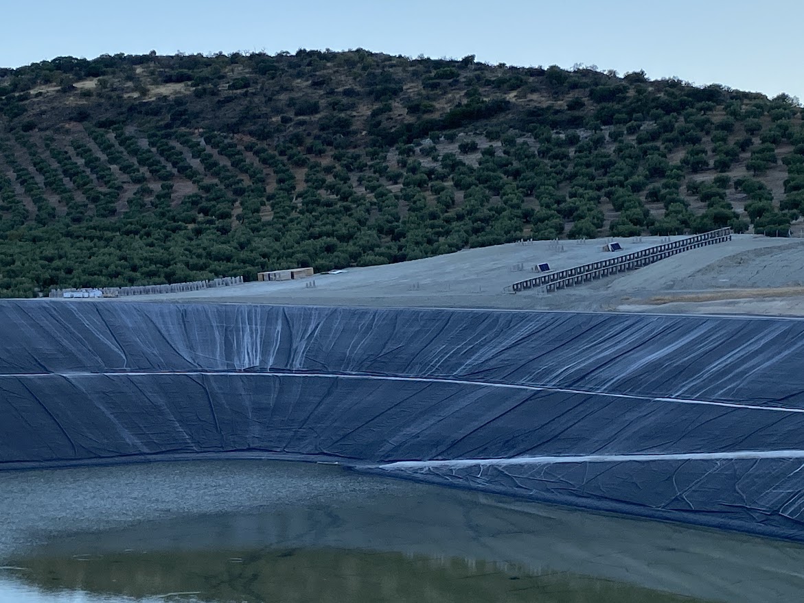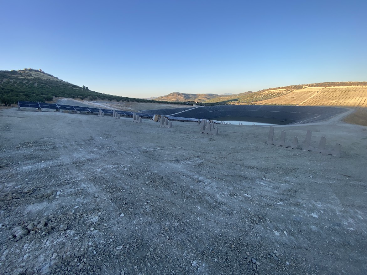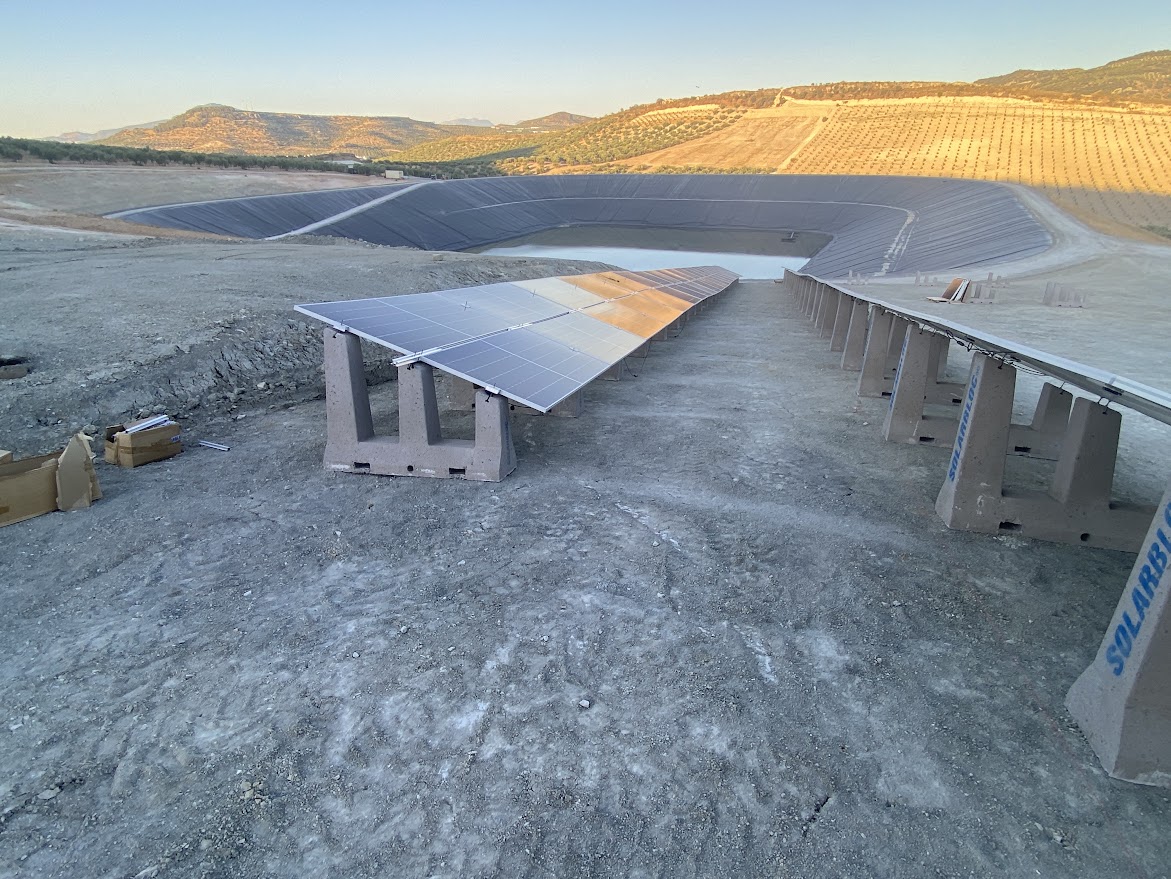 Junto a la balsa han comenzado a instalarse las placas fotovoltáicas cuya finalidad será la de bombear el agua regenerada a algunas de las parcelas de olivar aportadas a la Comunidad de Regantes, así como abaratar el coste del suministro eléctrico y contribuir a que el proyecto de riego resulte más sostenible mediante la utilización y aportación de este tipo de energía.
